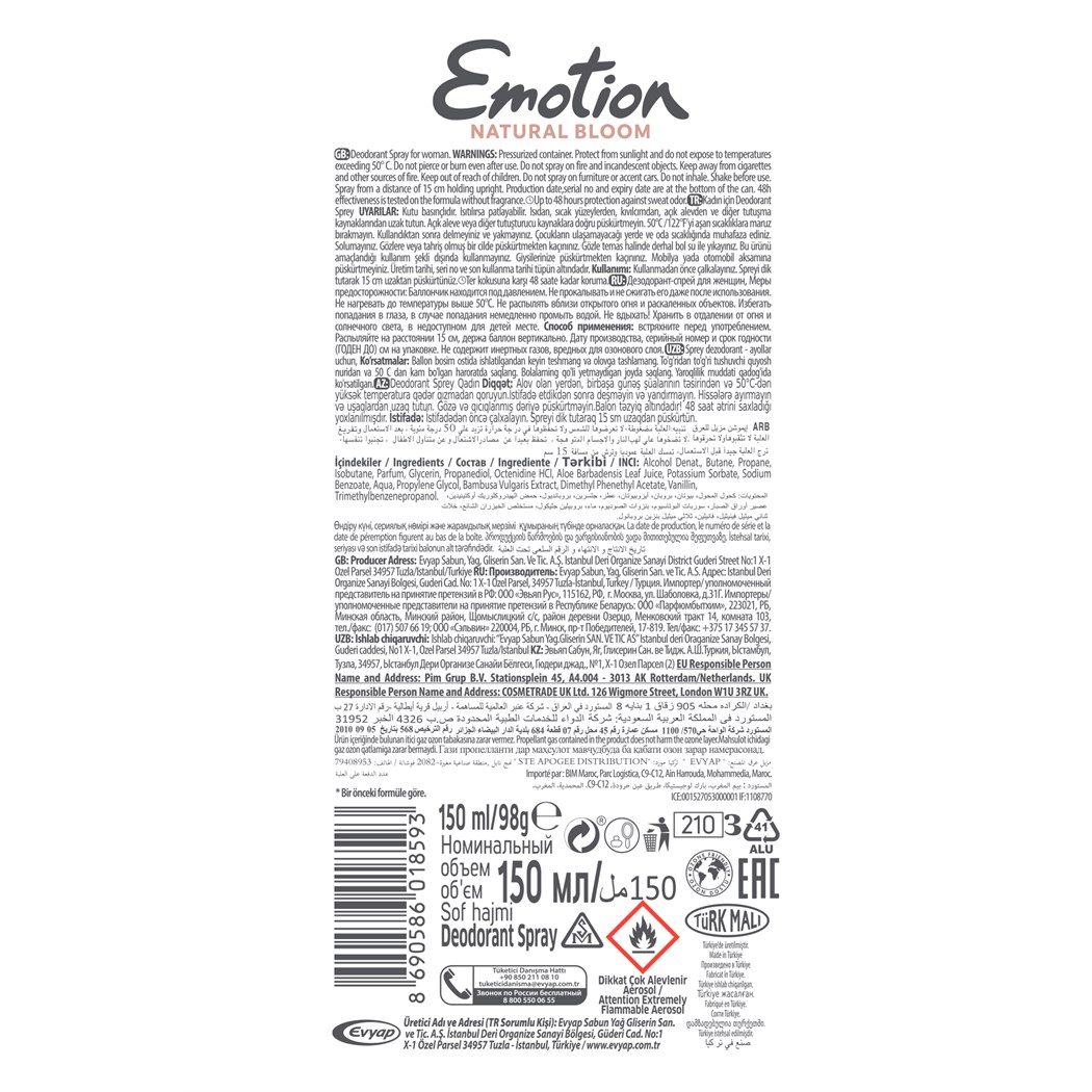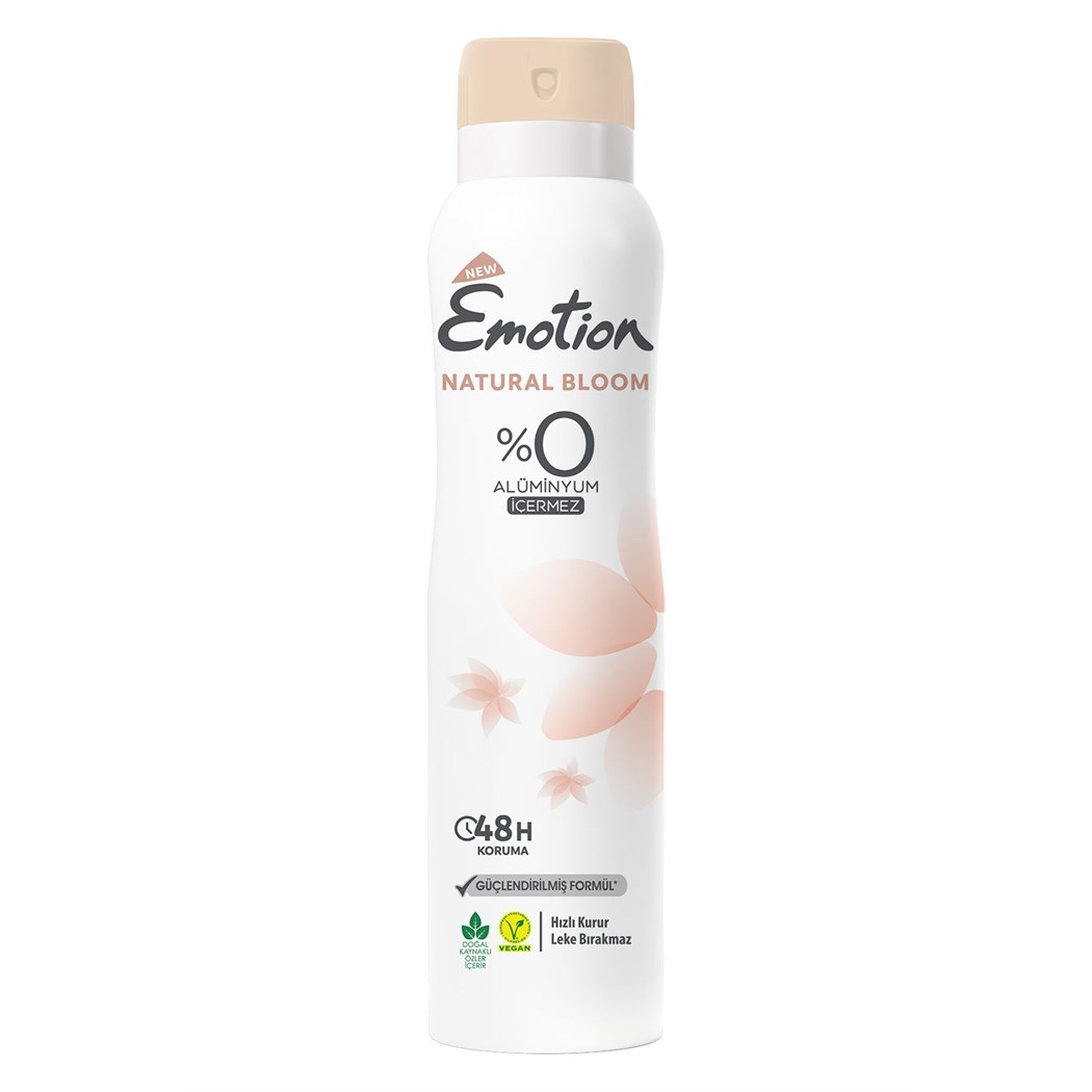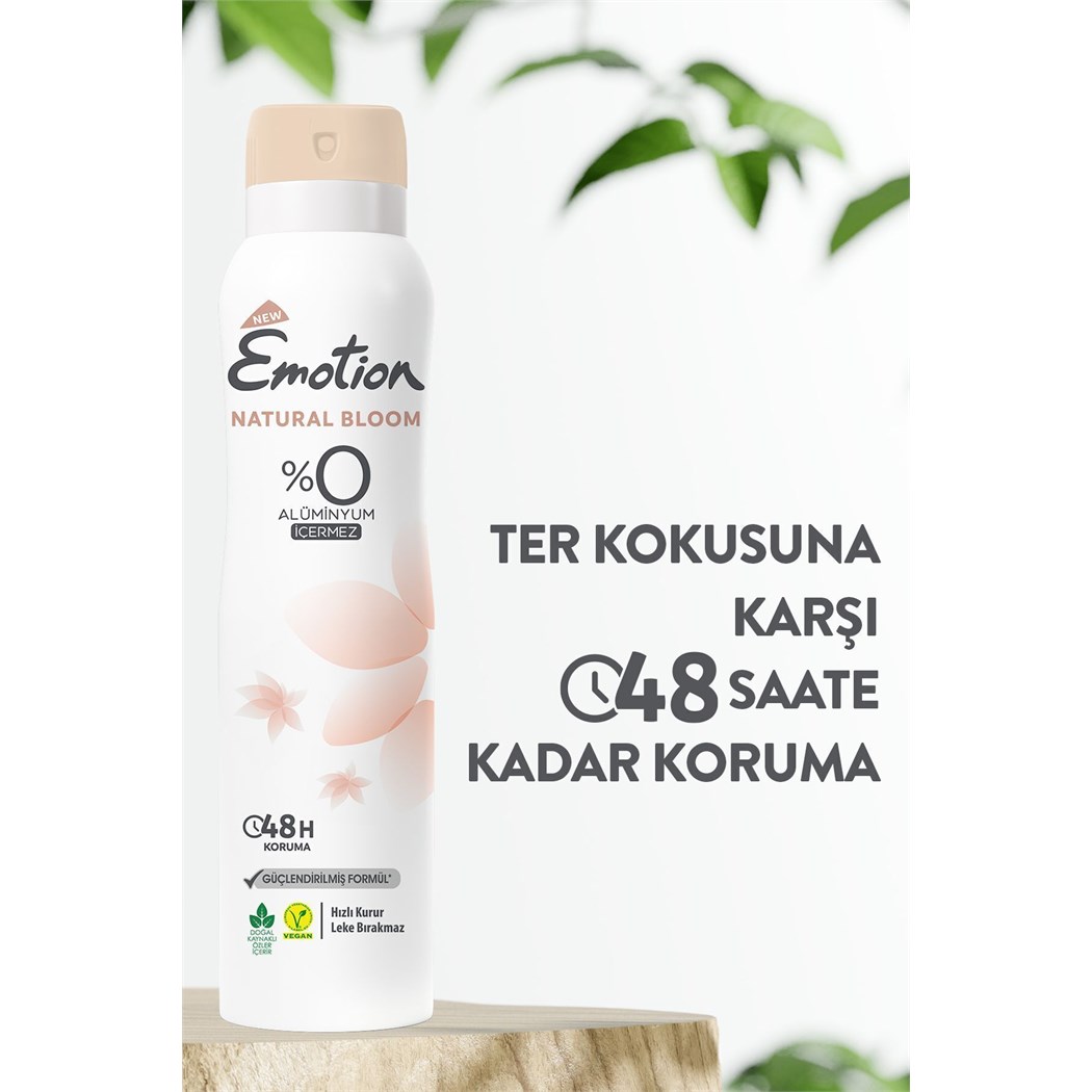 Emotion’la sen de terlemekten korkma!Emotion deodorantlar alüminyum içermez;gözenekleri tıkamaz.Vücudun doğal terleme dengesini etkilemeden ter kokusunu önler.Emotion Natural Bloom doğal kaynaklardan elde edilen özler içerir.Üstelik Vegan! Natural Bloom Koku Notaları Üstte meyveli unsurlar bulunan taze ve çiçek yeşili koku, misk ve hanımeli ile bir bahar çiçek buketi ortaya çıkarır ve odunsu alt tonlara sahip şefkatli bir misk tabanla desteklenir. Top : Armut, Yapraklı Yeşil, NarenciyeHeart: Gül, Yasemin, HanımeliBase: Hububat, Heliotrope